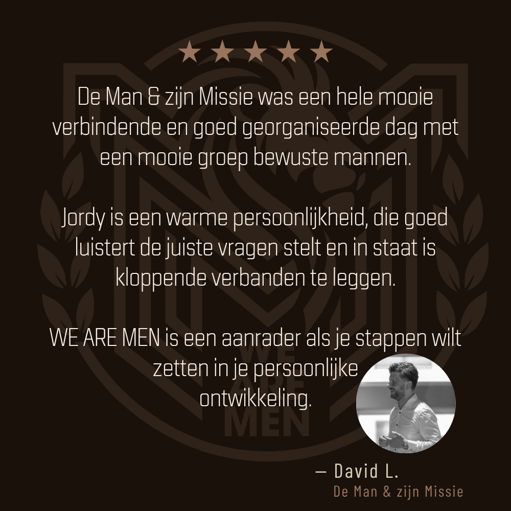 Vanuit dat besef richtte hij WE ARE MEN op. Via mannendagen, mannencirkels, workshops en een hechte community begeleidt hij mannen naar echte verbinding met zichzelf en met elkaar. Zonder masker, zonder oordeel. Van man tot man. Waar kwetsbaarheid geen zwakte is, maar je grootste kracht. En waar je de reis niet alleen hoeft te maken, maar met andere mannen aan je zijde.